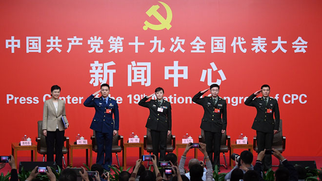 10月22日,中國共產黨第十九次全國代表大會新聞中心舉行主題為“中國特色強軍之路邁出堅定步伐”的集體采訪活動。