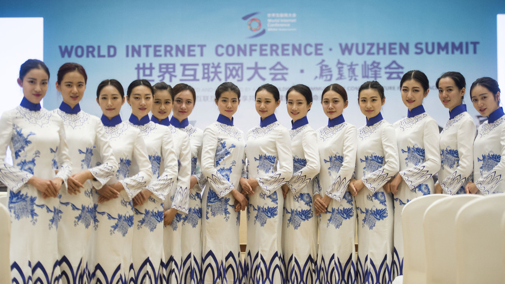 2015年12月13日,浙江烏鎮枕水酒店,浙江傳媒學院的大學生禮儀換上第二屆世界互聯網大會的青花瓷旗袍首次亮相。