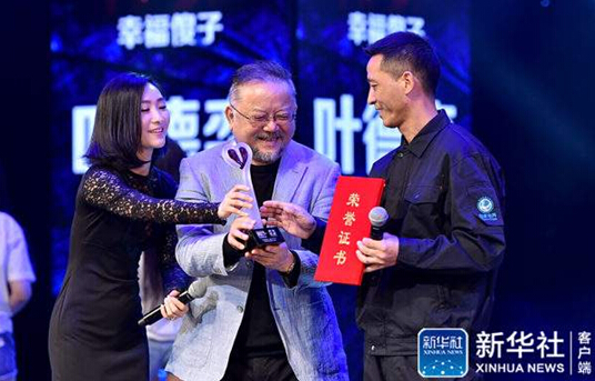 1月18日,著名演員王剛(中)、青年演員陶昕然(左)為“幸福傻子”葉德奕頒獎(jiǎng)。新華社記者李鑫攝