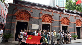 石庫門廳堂正中是一張長方形餐桌,10余只圓凳圍繞餐桌依次擺放,玻璃花瓶、白底彩繪茶具、電燈等也均以原貌陳列。石庫門廳堂正中是一張長方形餐桌,10余只圓凳圍繞餐桌依次擺放,玻璃花瓶、白底彩繪茶具、電燈等也均以原貌陳列。