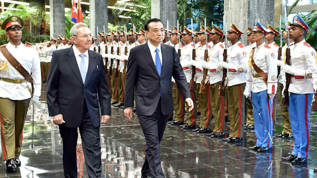 當地時間24日下午,古巴國務委員會主席兼部長會議主席勞爾·卡斯特羅在哈瓦那革命宮主持儀式,歡迎中國國務院總理李克強對古進行正式訪問。軍樂團奏響中古兩國國歌,儀仗兵整齊列隊,持槍向兩國領導人致禮。
