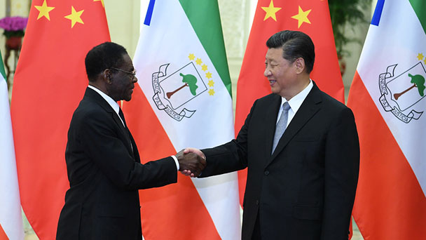 國家主席習近平2日在人民大會堂會見赤道幾內亞總統奧比昂。