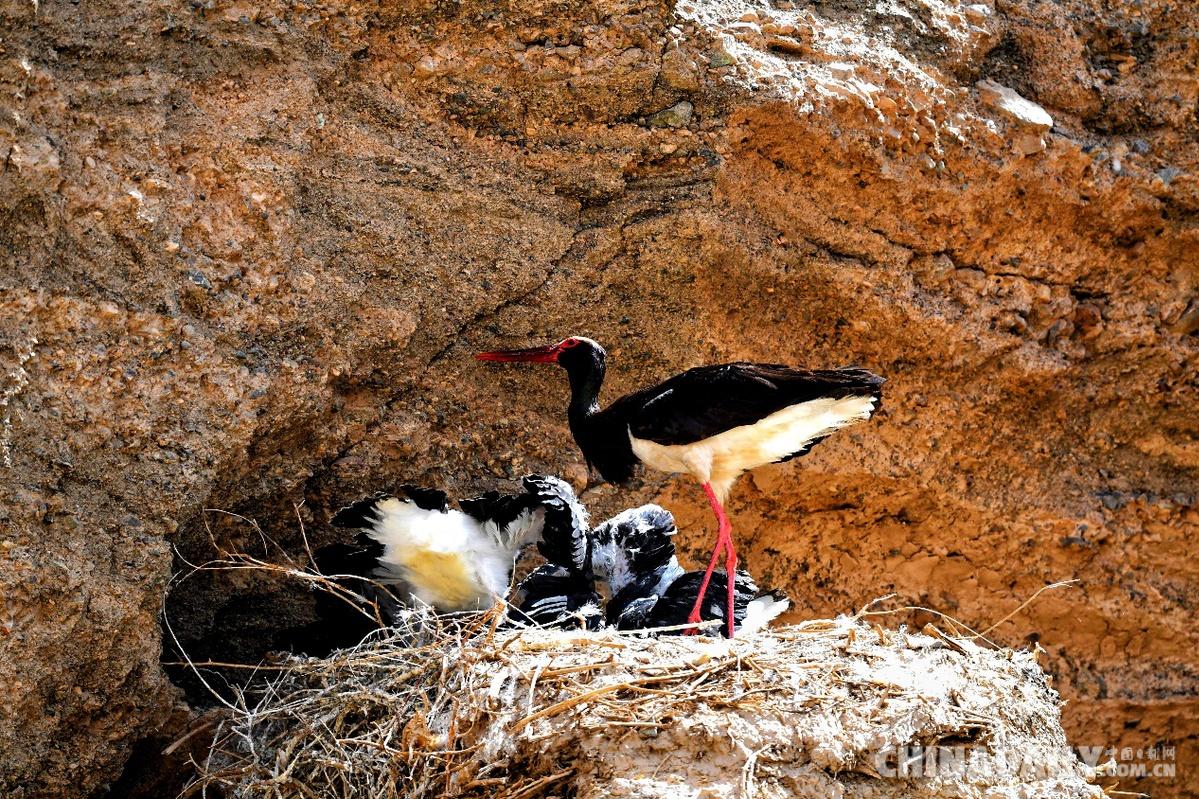 近日,祁連山國家公園甘肅省管理局酒泉分局鹽池灣保護站巡護人員在黨河峽谷監測到國家一級保護瀕危鳥類黑鸛悉心哺育幼鳥的珍貴畫面。
