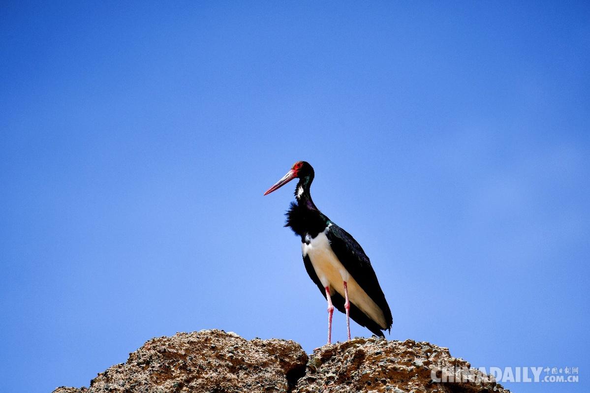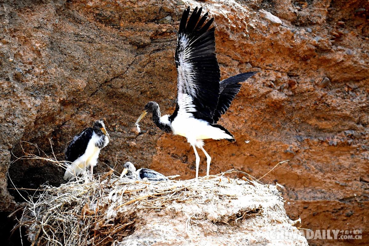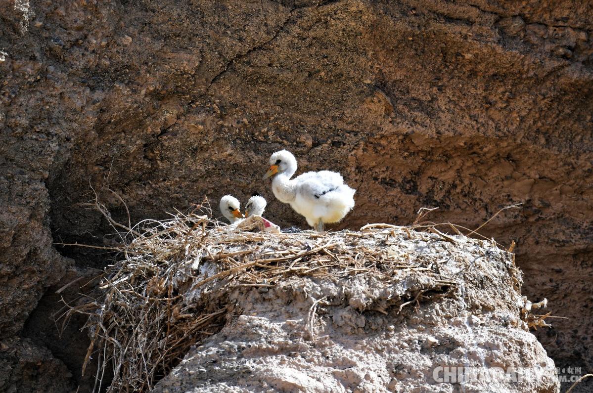 據保護站巡護人員介紹,黑鸛在祁連山境內屬于夏候鳥,主要繁殖于河流兩岸、高山山頂裸巖的巖壁平臺上,每年4月下旬開始筑巢,7月中旬就可看到成鳥領著幼鳥覓食。此次監測到黑鸛巢居并孵育雛鳥,是首次記錄到黑鸛繁殖。