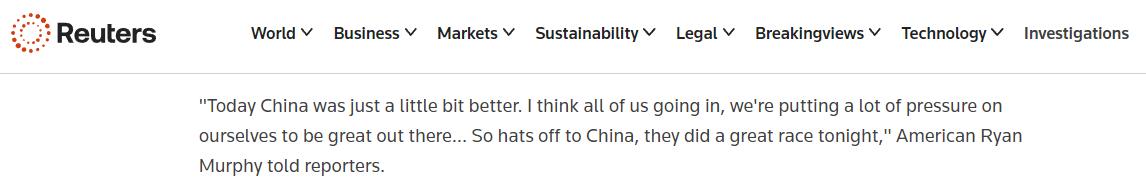 中國(guó)選手的優(yōu)異表現(xiàn)不僅贏得了獎(jiǎng)牌,也收獲了對(duì)手的尊重。據(jù)路透社報(bào)道,在男子4x100米混合泳接力決賽后,美國(guó)選手瑞恩·墨菲接受采訪(fǎng)時(shí)表示,“今天中國(guó)隊(duì)表現(xiàn)要更好一些……我要向中國(guó)隊(duì)致敬,他們今晚的比賽非常精彩。”