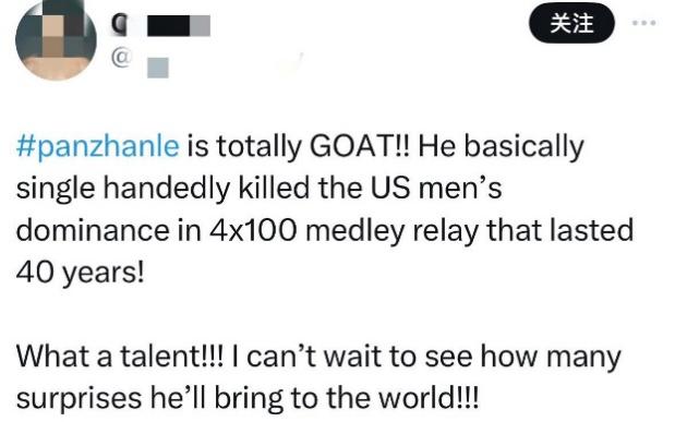 一位海外網(wǎng)友在海外社交媒體平臺(tái)X上大贊潘展樂(lè),“潘展樂(lè)是偉大的游泳運(yùn)動(dòng)員……他真是個(gè)天才!我迫不及待地想看看他會(huì)給世界帶來(lái)多少驚喜!”
