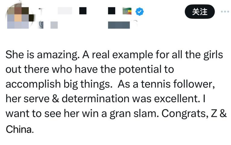 一位X用戶(hù)寫(xiě)道:(鄭欽文)太棒了。對(duì)于所有要做大事的女孩來(lái)說(shuō),她是一個(gè)生動(dòng)的榜樣。作為一名網(wǎng)球愛(ài)好者,她的發(fā)球和決心非常出色。我希望看到她贏得大滿(mǎn)貫。恭喜鄭欽文和中國(guó)隊(duì)。