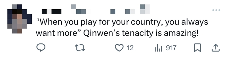 另一位網(wǎng)友稱(chēng):“‘當(dāng)你為祖國(guó)而戰(zhàn)時(shí),你總是想要更拼’,鄭欽文的堅(jiān)韌令人驚嘆!”