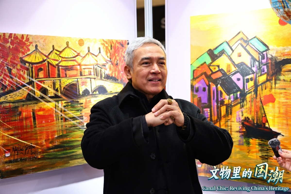 印尼畫家海蒂向記者展示了他創(chuàng)作的一幅關(guān)于揚(yáng)州五亭橋的畫作。這是他在2024年跟隨“文物里的國(guó)潮”活動(dòng)來到揚(yáng)州后,被當(dāng)?shù)赜凭玫臍v史文化所打動(dòng)而創(chuàng)作的作品。海蒂表示,這次經(jīng)歷讓他更加深愛中國(guó),希望通過自己的作品,向世界展示中國(guó)傳統(tǒng)文化的獨(dú)特魅力。