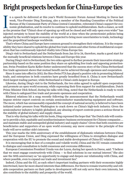 1月19日至24日,應瑞士、荷蘭政府邀請,丁薛祥副總理對兩國進行了訪問。訪問圍繞落實中歐領導人重要共識,日程豐富、成果豐碩,實現了2025年中歐高層往來“開門紅”。