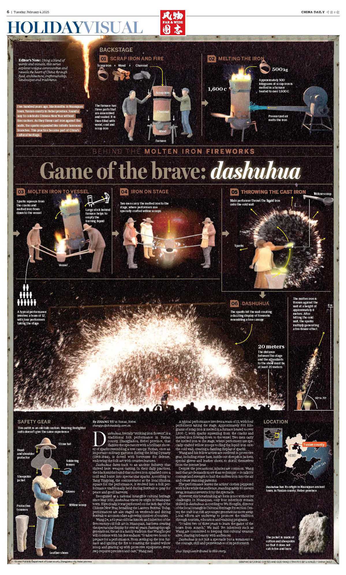 中國日報網(wǎng)2月4日電(記者 田馳 單娟 李欣磊 Jorge Cortes 張余 郭研奇)2025年2月4日,《中國日報》第6版刊發(fā)整版報道Game of the brave: dashuhua。該報道是中國日報風物圖志(Far&Wide)欄目第十一期,以信息可視化形式展現(xiàn)“風物”之美,介紹了中國歷史文化名鎮(zhèn)——河北張家口蔚縣暖泉古鎮(zhèn)獨特的民俗活動“打樹花”。精美的版面設計展示了“打樹花”制作工藝流程,呈現(xiàn)了“火樹金花不夜天”的壯麗景觀。