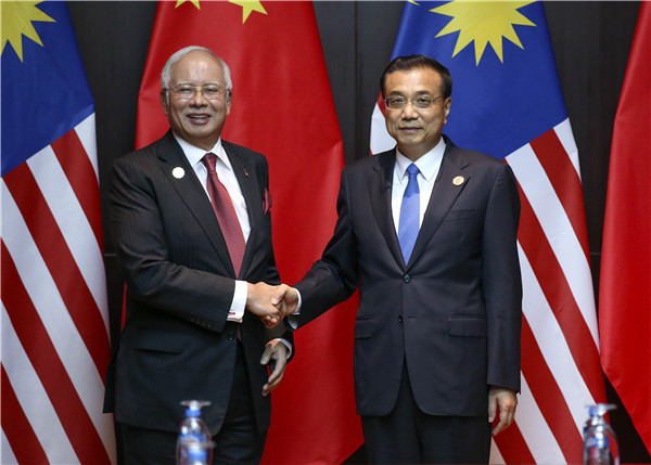 國務院總理李克強當地時間7日晚在萬象國際會議中心會見馬來西亞總理納吉布。