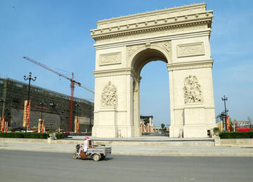 2015年8月23日,河南省鄭州市西四環(huán)一家居市場(chǎng)內(nèi)的廣場(chǎng)上,有一座雄偉的山寨版“凱旋門”格外引人注意,有多名市民圍觀拍照。文君/東方IC  河南鄭州山寨版“凱旋門”。文君/東方IC  河南鄭州山寨版“凱旋門”。