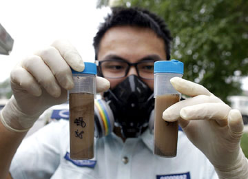 2015年8月18日,天津,來自北京市環境保護監測中心的工作人員在展示從天津爆炸區域采樣的氰化物和土壤水樣。