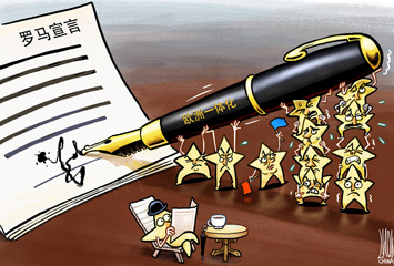3月25日,除英國之外的歐盟27個(gè)成員國領(lǐng)導(dǎo)人齊聚意大利首都羅馬,簽署《羅馬宣言》。
