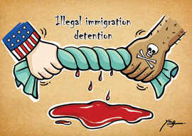 美國非法移民拘留所對非法移民剝削,每天提供1-3美元超級低薪,真是名副其實的“吸血鬼”。