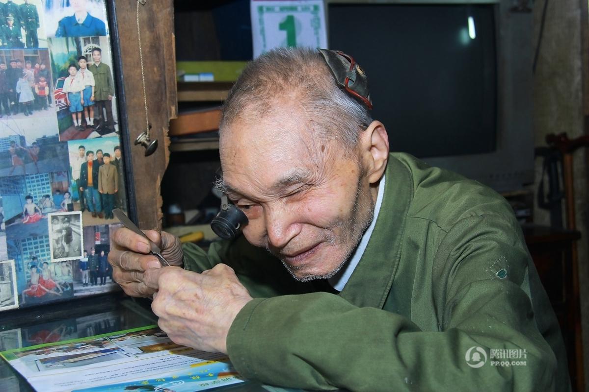 2015年9月1日,四川達州,88歲修表匠張鎮龍打開店門,撐出幌子,等候顧客來訪。 2015年9月1日,四川達州,88歲修表匠張鎮龍打開店門,撐出幌子,等候顧客來訪。手機數碼時代終結了老人的手藝活兒,盡管10多年沒再修過一塊表,但他仍堅持每日開門營業。