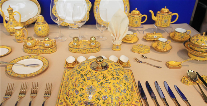 2015年9月4日,江蘇省南京市,在南京城市文化客廳“世茂·云錦極致精華館”拍攝的2014年APEC國宴餐具。2015年9月4日,江蘇省南京市,在南京城市文化客廳“世茂·云錦極致精華館”拍攝的2014年APEC國宴餐具。