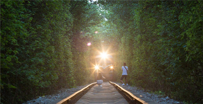 2015年9月4日報道,南京江寧“愛情隧道”,一列火車駛來,一名女孩不躲不閃,守在軌道中央拍照。去年,江蘇省南京江寧區的一段鐵路兩側濃密的植被樹枝,在過往火車的“削磨”下,形成天然的綠色隧道。