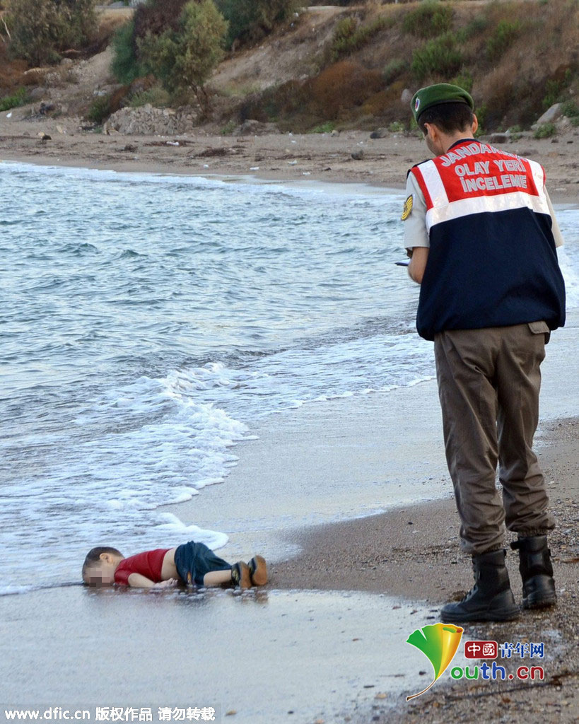 當地時間2015年9月2日,土耳其博德魯姆,土耳其憲兵站在被沖上海灘的難民兒童尸體旁。當地時間2015年9月3日,土耳其安卡拉,民眾在聯合國辦事處外靜坐示威,抗議敘利亞男童偷渡希臘遭遇沉船,最后浮尸土耳其海灘。