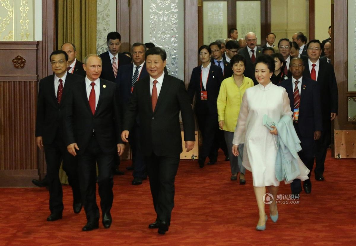 9月3日,中國人民抗日戰爭暨世界反法西斯戰爭勝利70周年紀念大會在北京隆重舉行。上午,閱兵開始前,習近平與彭麗媛在北京故宮端門南廣場迎接來華出席抗戰紀念活動的外國嘉賓,彭麗媛以一席“中國紅”優雅禮裙迎接外賓。