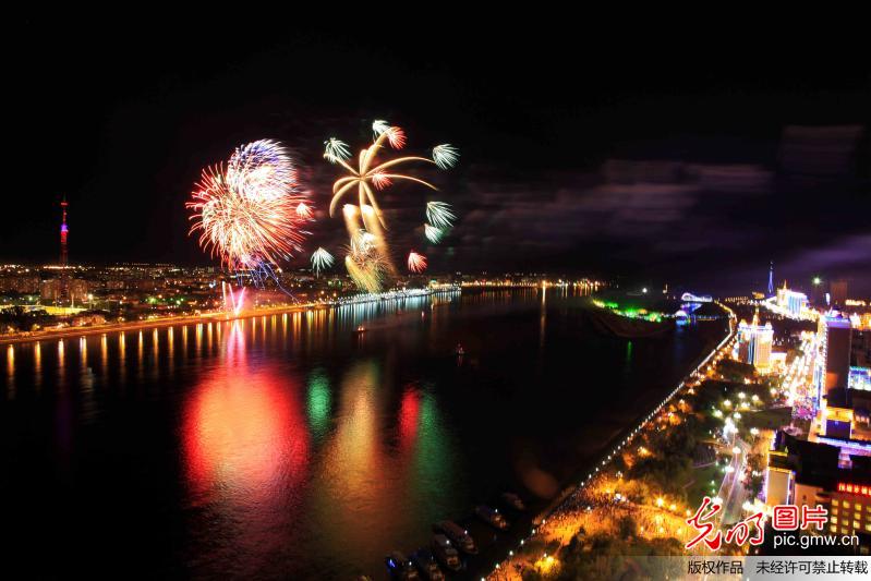 中俄民眾黑龍江邊齊放煙花慶抗戰勝利70周年