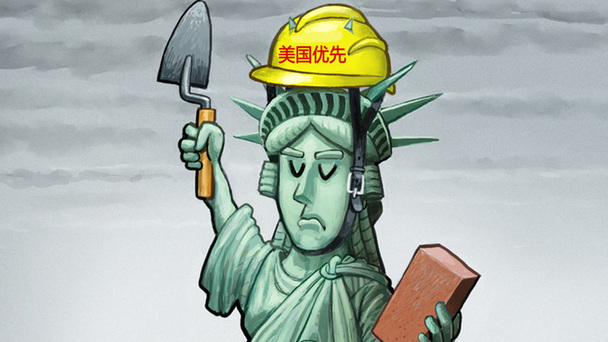 在“美國優先”政策的左右下,美國大肆實行貿易保護,自由女神變成了一個砌磚的工人。