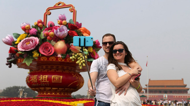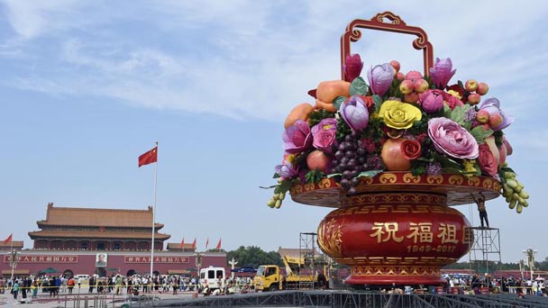 2017年9月25日,北京天安門廣場中心花壇“祝福祖國”巨型花籃布置完畢。今年的大花籃以喜慶的“花果籃”為主景,籃內擺放著柿子、石榴、蘋果以及牡丹、玉蘭、月季等仿真花果,寓意十八大以來我國在各領域取得的輝煌成就。
