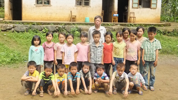 廣西大化瑤族自治縣雅龍鄉溫和小學巴丁教學點,蒙志年生前和孩子們合影(資料照片)。位于廣西西北部大石山區的大化瑤族自治縣雅龍鄉溫和小學巴丁教學點,群山環繞,交通十分不便。