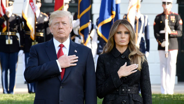 9月11日,美國白宮南草坪舉行活動紀念911恐襲16周年,總統特朗普攜第一夫人梅拉尼婭默哀,悼念那些在911中逝去的生命。