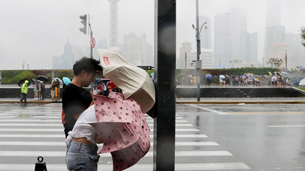 當(dāng)日,今年第18號臺風(fēng)“溫比亞”在上海浦東新區(qū)南部沿海登陸。新華社記者 方喆 攝 8月17日,在上海外灘,一名小朋友的雨傘在大風(fēng)中被吹變形。