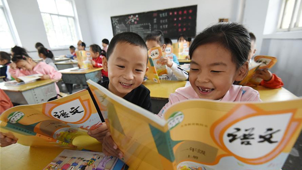 8月30日,上海市金山區海棠小學一年級新生展示領到的語文部編教材。中小學全新“部編教材”啟用,租房也能上名校,一入小學就開始上科學課……今年秋季開學,系列“新政”新鮮出爐,牽動千家萬戶。