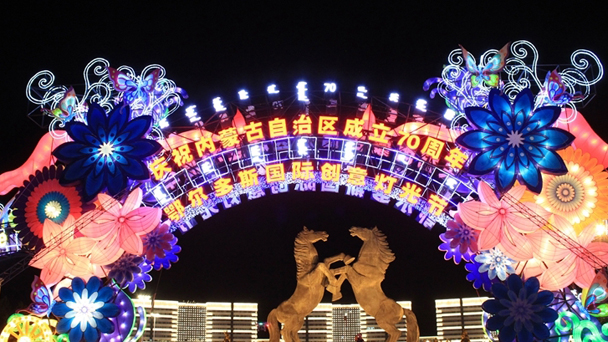 為熱烈慶祝內蒙古自治區成立70周年,迎接9月即將召開的《聯合國防治荒漠化公約》第十三次締約方大會,為期6個月的大型國際創意燈光節活動正在鄂爾多斯市康巴什區開展。新華網發 (張鑫攝)圖為燈光節現場。