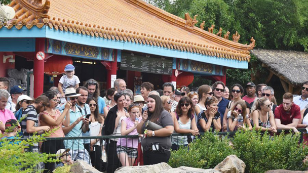 8月5日,在法國博瓦勒野生動物園,游客聽工作人員介紹熊貓“媽媽”歡歡和幼崽的最新狀況。8月4日晚間,生活在該園的中國旅法大熊貓“歡歡”誕下一對雄性雙胞胎,其中一只出生不久后夭折,存活的幼崽狀況良好,體重達142克。