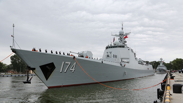 參加中俄“海上聯(lián)合—2017”演習(xí)的中國(guó)海軍艦艇編隊(duì)當(dāng)?shù)貢r(shí)間21日抵達(dá)俄羅斯加里寧格勒波羅的斯克軍港,俄海軍在碼頭舉行莊重的歡迎儀式。