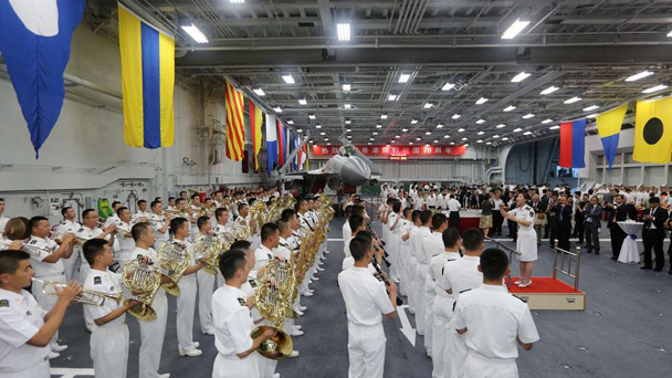 7月7日晚,遼寧艦軍樂團官兵在甲板招待會上演奏樂曲。