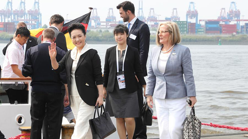 當地時間7月7日上午,應德國總理默克爾丈夫紹爾邀請,國家主席習近平夫人彭麗媛同出席二十國集團領導人第十二次峰會的部分代表團團長配偶乘船參觀漢堡港。新華社記者 王曄 攝