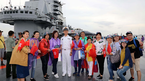 7月8日上午,參加香港回歸暨解放軍進駐香港20周年慶祝活動的遼寧艦航母編隊舉行艦艇開放,千余民香港市民冒雨登上遼寧艦參觀。