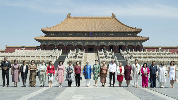 5月15日,國家主席習(xí)近平夫人彭麗媛邀請(qǐng)出席“一帶一路”國際合作高峰論壇的外方團(tuán)長配偶參觀世界文化遺產(chǎn)——故宮博物院。這是彭麗媛同來賓們?cè)谔偷钋昂嫌傲裟睢P氯A社記者 謝環(huán)馳 攝
