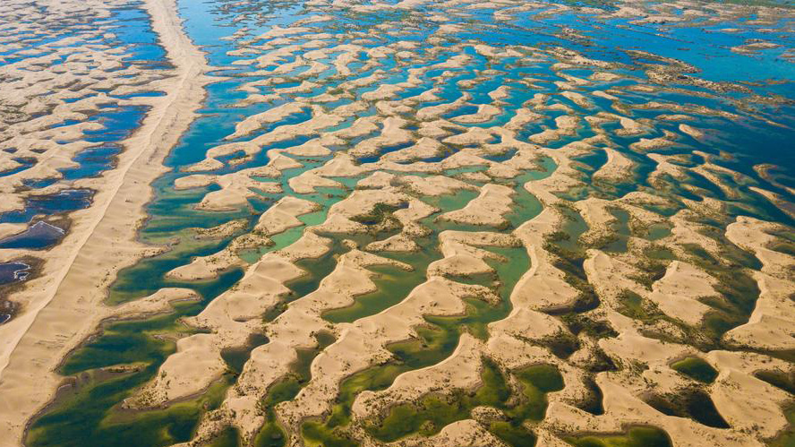 內(nèi)蒙古杭錦旗在黃河凌汛期向沙漠引水,讓水患變水利,沙地變濕地,庫(kù)布其沙漠北緣顯現(xiàn)出“水沙共存”美景(8月1日無(wú)人機(jī)拍攝)。新華社記者劉磊攝  位于內(nèi)蒙古杭錦旗的七星湖沙漠酒店(8月1日無(wú)人機(jī)拍攝)。