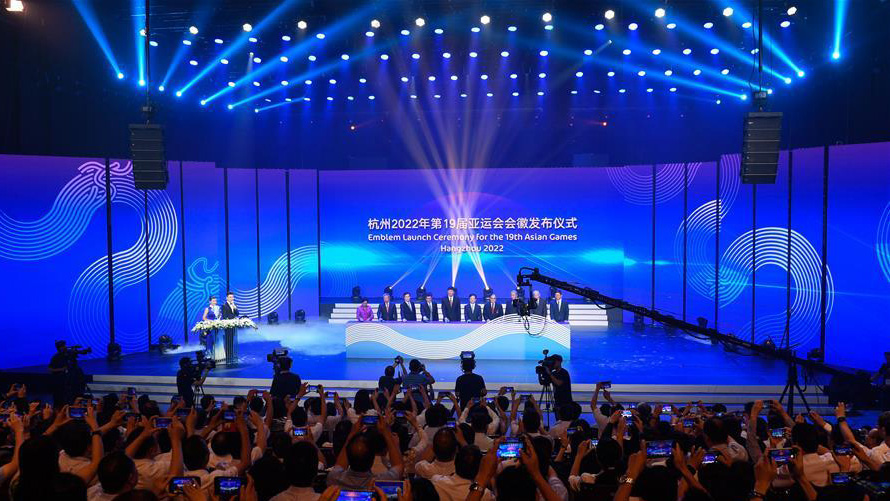 8月6日,杭州2022年亞運(yùn)會(huì)會(huì)徽發(fā)布儀式在浙江省杭州市舉行。圖為杭州2022年第19屆亞運(yùn)會(huì)會(huì)徽發(fā)布儀式現(xiàn)場(chǎng)(8月6日攝)。新華社記者黃宗治攝  8月6日,杭州2022年亞運(yùn)會(huì)會(huì)徽發(fā)布儀式在浙江省杭州市舉行。