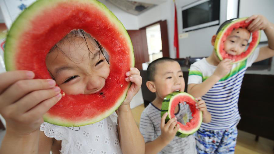 8月7日,在山東省濰坊市奎文區(qū)東關(guān)街道中和園社區(qū),小朋友在吃西瓜“啃秋”。當(dāng)日是二十四節(jié)氣中的立秋,我國(guó)民間有“立秋啃秋”的習(xí)俗,即在立秋這一天吃西瓜,表達(dá)“啃下酷夏、迎接秋爽”的愿望。新華社發(fā)(邵世新 攝)  8月7日,在山東省濱州市博興縣店子鎮(zhèn)耿郭村,小朋友在吃西瓜“啃秋”。
