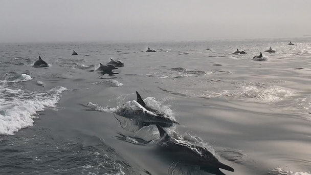 日前,幾名海釣“釣友”出海時,在廣東汕頭南澳島海域巧遇數百只海豚“集體競速”,他們用無人機記錄下這一場面。