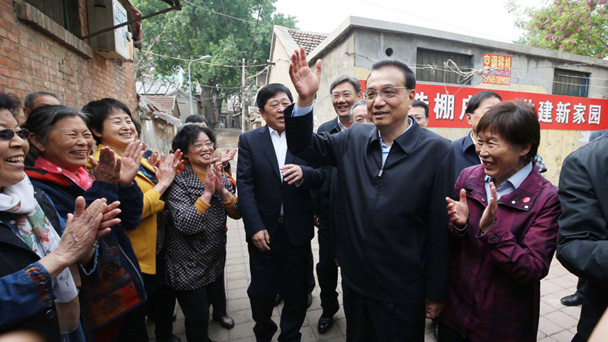 李克強21日考察濟南槐蔭區經十一路棚戶區??偫韺Ξ數刎撠熑苏f,棚戶區改造既是彌補歷史欠賬的民生工程,也是推進新型城鎮化的重要途徑,還能促進房地產市場平穩健康發展。