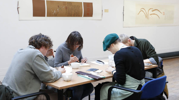 2月16日至24日,英國王儲傳統藝術學院舉辦“十竹齋木版水印藝術傳承”文獻作品展,十竹齋木版水印非遺傳承人魏立中在展覽期間向學員傳授木版水印技藝。