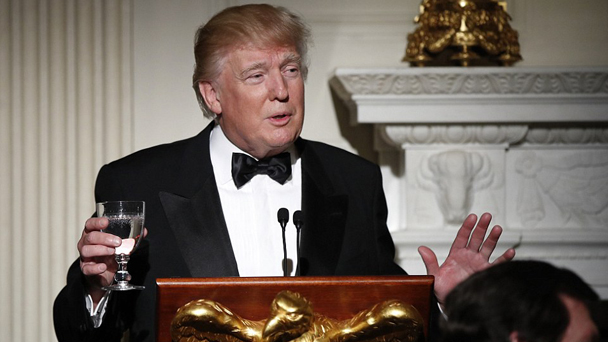 當地時間2月26日,美國總統特朗普和夫人梅拉尼婭出席在白宮州長晚宴。特朗普在致敬酒詞時表示,就職之后的4周充滿了樂趣,這項工作很簡單。