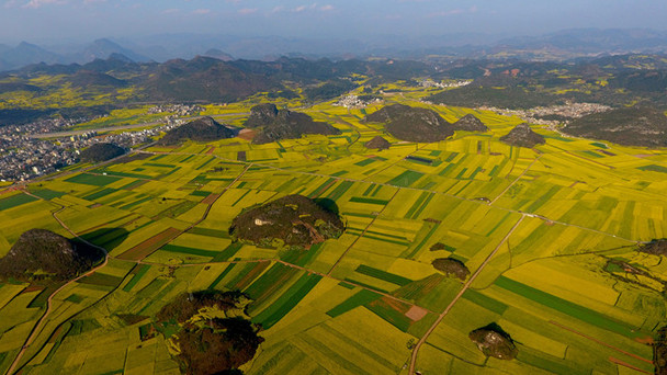 云南省羅平縣80萬畝油菜花海創下了“世界最大自然天成花園”的吉尼斯世界紀錄,這里的油菜花也是全國開得最早的地方。
