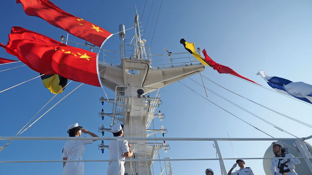 當地時間2018年7月31日,正在執行“和諧使命‐2018”任務的中國海軍和平方舟醫院船在南太平洋海域舉行隆重升旗儀式,慶祝中國人民解放軍建軍91周年。