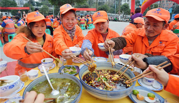 暖心!重慶一餐飲店請526名環衛工吃團年飯