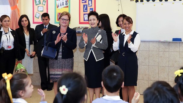 當?shù)貢r間21日上午,國家主席習近平夫人彭麗媛在利馬參觀若望二十三世秘中學校。